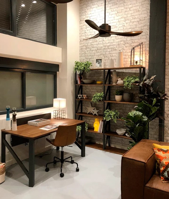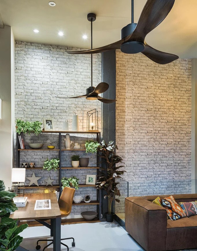 Wentylatory sufitowe, energooszczędne i z funkcją grzania/chłodzenia, pochodzą od Klassfan i mają nowoczesny design, idealny do naszego projektu. Ich połączenie z lampą umieszczoną nad sofą, od Fokobu, tworzy bardzo atrakcyjny efekt i dodatkowo pomaga stworzyć przytulniejszą atmosferę w przestrzeni z wysokimi sufitami.