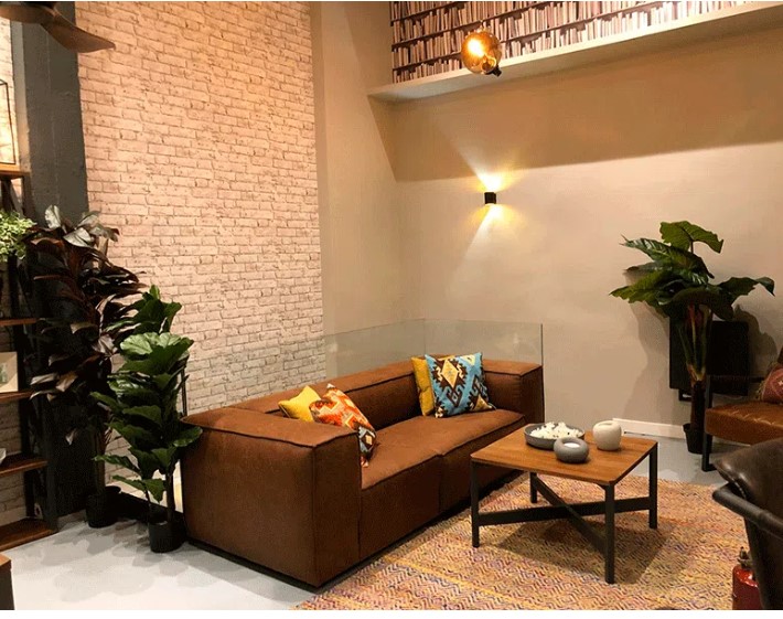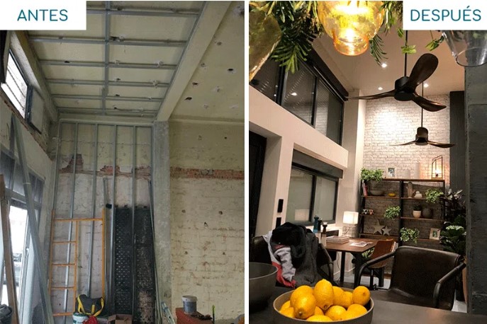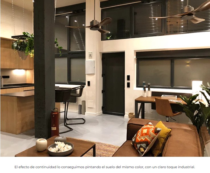 Jednym ze sposobów na uzyskanie efektu ciągłości w całym mieszkaniu była farba na podłodze, która imituje beton, nadając mu pożądany industrialny charakter. Naturalne wykończenia drewna, znane również jako efekt surowy, w meblach pomagają stworzyć tę atmosferę, która jest wzmocniona przez detale w farbie imitującej żelazo. Dzięki tapetom imitującym cegłę, naturalnemu drewnu i efektowi żelaza uzyskaliśmy bardzo atrakcyjny i przytulny rezultat.