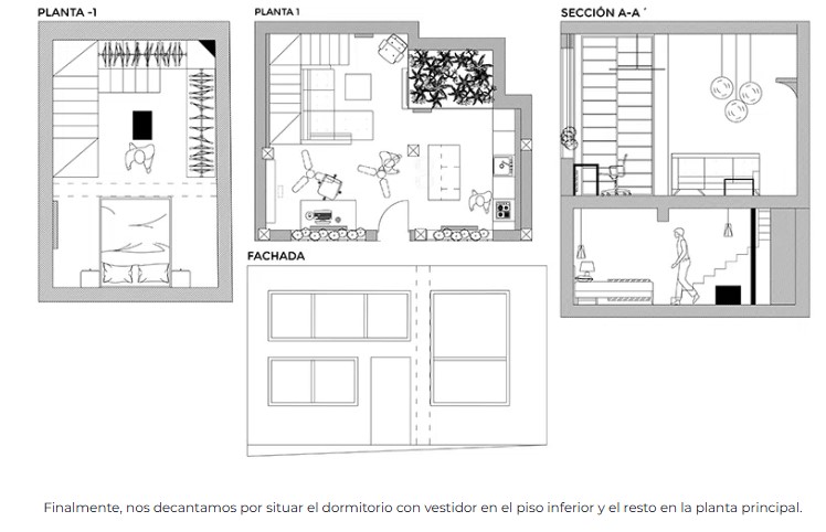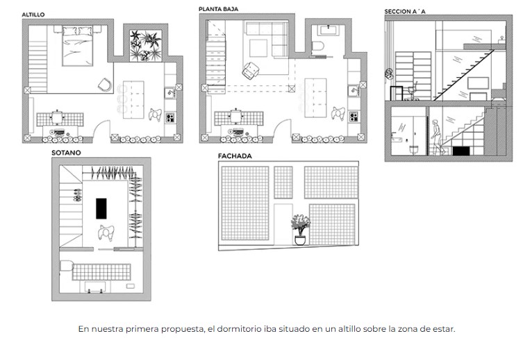Jedną z naszych pierwszych opcji było stworzenie antresoli z sypialnią na głównym piętrze. Duża wysokość sufitów, która wzrosła po usunięciu podwieszanego sufitu, pozwoliła nam rozważyć wykorzystanie każdej przestrzeni do innej funkcji. W naszej pierwszej propozycji garderoba i duża łazienka znajdowały się na dolnej kondygnacji, tworząc bardzo osobistą i intymną strefę. Następnie na głównym piętrze znajdowały się kuchnia, strefa wypoczynkowa, mała toaleta oraz przestrzeń do pracy. Na koniec, na antresoli, umieszczono przytulną sypialnię.