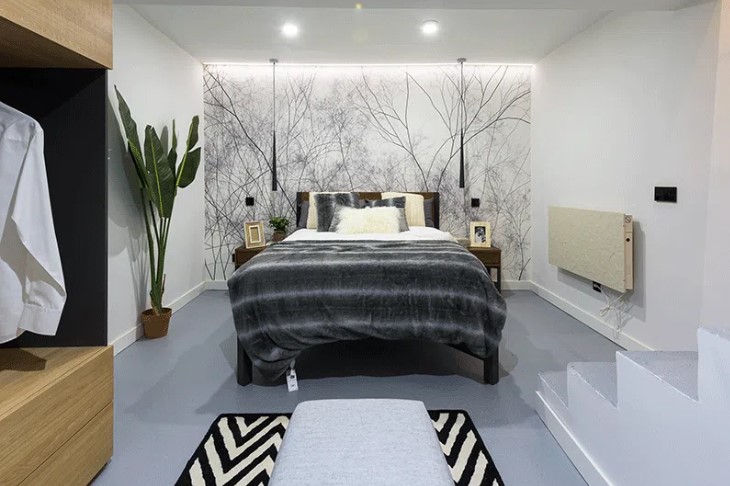 Tapeta w sypialni, od Glamora, pomaga stworzyć głębię w pomieszczeniu.