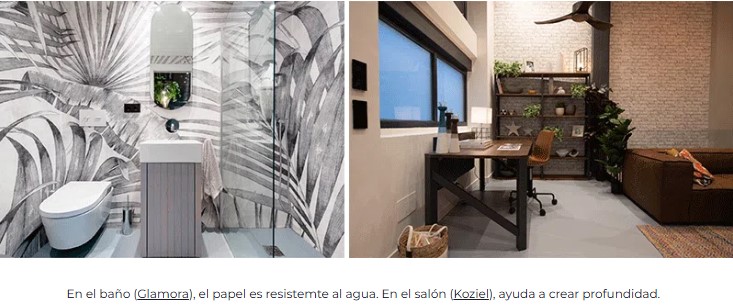 W łazience (Glamora) tapeta jest odporna na wodę. W salonie (Koziel) pomaga stworzyć głębię.